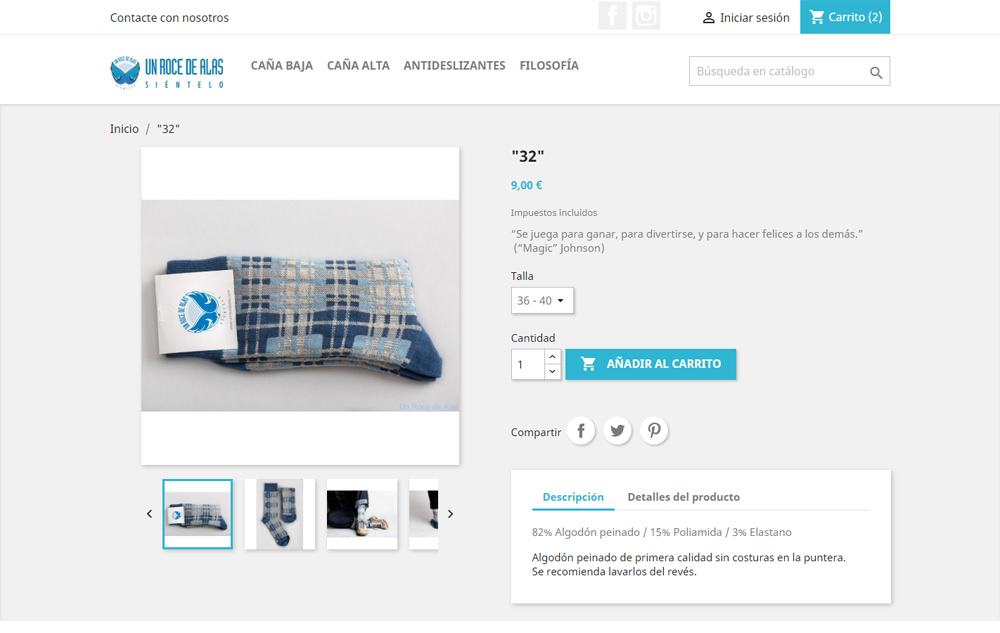 Desarrollo de tienda virtual con software libre Prestashop, venta de calcetines de diseño. Integración y configuración, pago con tarjeta Redsys y paypal, venta a España. Diseño responsivo adaptado a móviles.